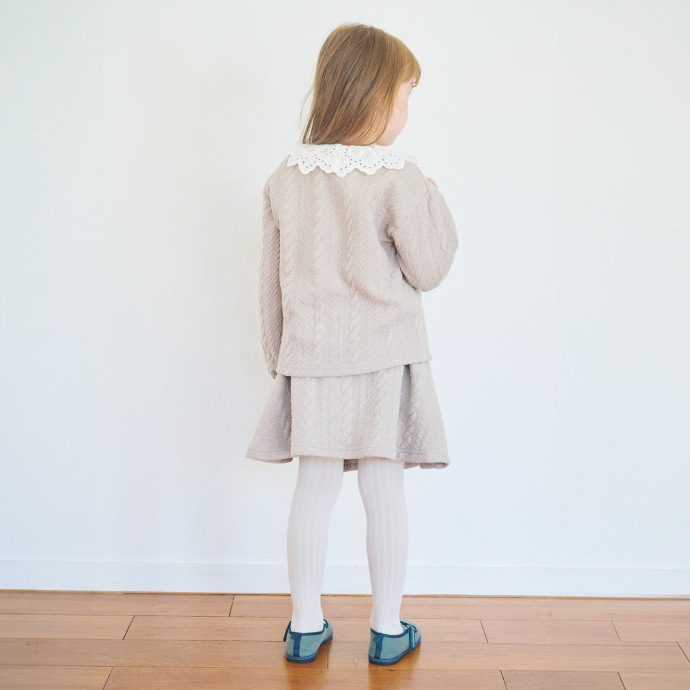【カーディガン】 90 cm 総丈36.0 肩幅32.4 胸囲34.0 袖丈25.8 100cm 総丈39.0 肩幅34.2 胸囲36.0 袖丈29.9 110cm 総丈42.0 肩幅36.0 胸囲38.0 袖丈34.0 120cm 総丈45.0 肩幅37.8 胸囲40.0 袖丈38.1 130cm 総丈48.0 肩幅39.6 胸囲42.2 袖丈42.2 140cm 総丈51.0 肩幅42.4 胸囲45.0 袖丈45.8 【スカート】 90 cm 総丈 22.5 ウエスト 21.0 股下 6.0 100cm 総丈 25.0 ウエスト 22.0 股下 6.5 110cm 総丈 27.5 ウエスト 23.0 股下 7.0 120cm 総丈 30.0 ウエスト 24.0 股下 7.5 130cm 総丈 32.5 ウエスト 25.0 股下 8.0 140cm 総丈 35.5 ウエスト 26.0 股下 8.5 |
