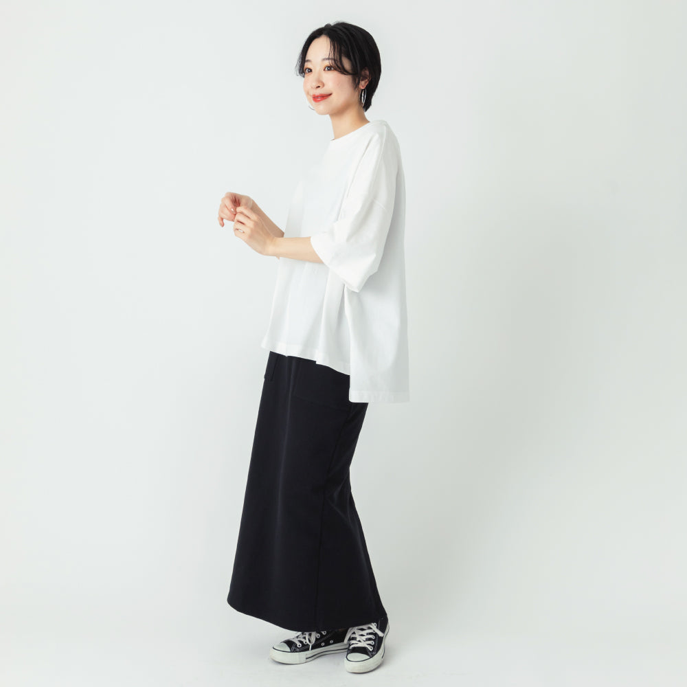 よさげな白Tをさがしてたところレビューに後押しされて購入しました。パンツが好きだからパンツによく合わせてるけどいい感じです。5分袖だから腕も出しすぎないで済むし、真夏の紫外線でもある程度日よけにもなるしで、長いシーズン着られそうです。