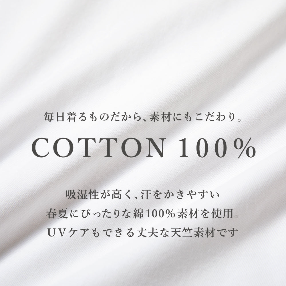 吸湿性が高く、汗をかきやすい春夏にぴったり。UVケアもできる丈夫な天竺素材です。
