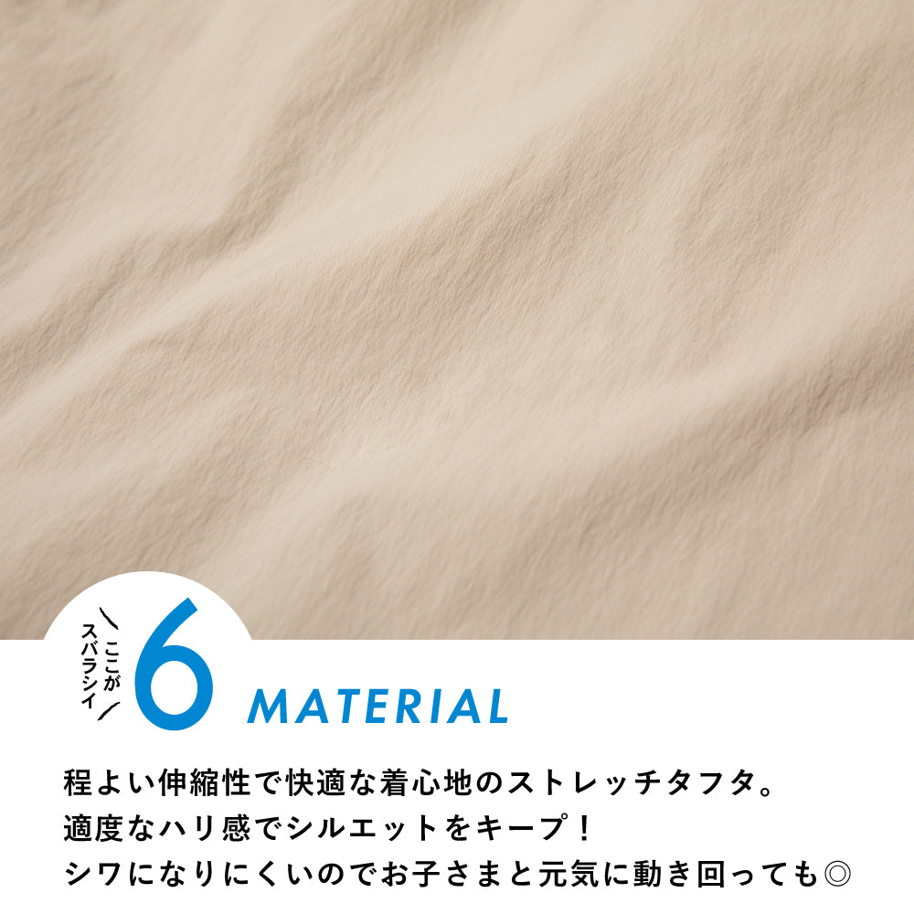 はっ水加工を施した「ストレッチタフタ素材」を使用。濡れても水が玉になるのでパッと払えて急な雨でも安心!