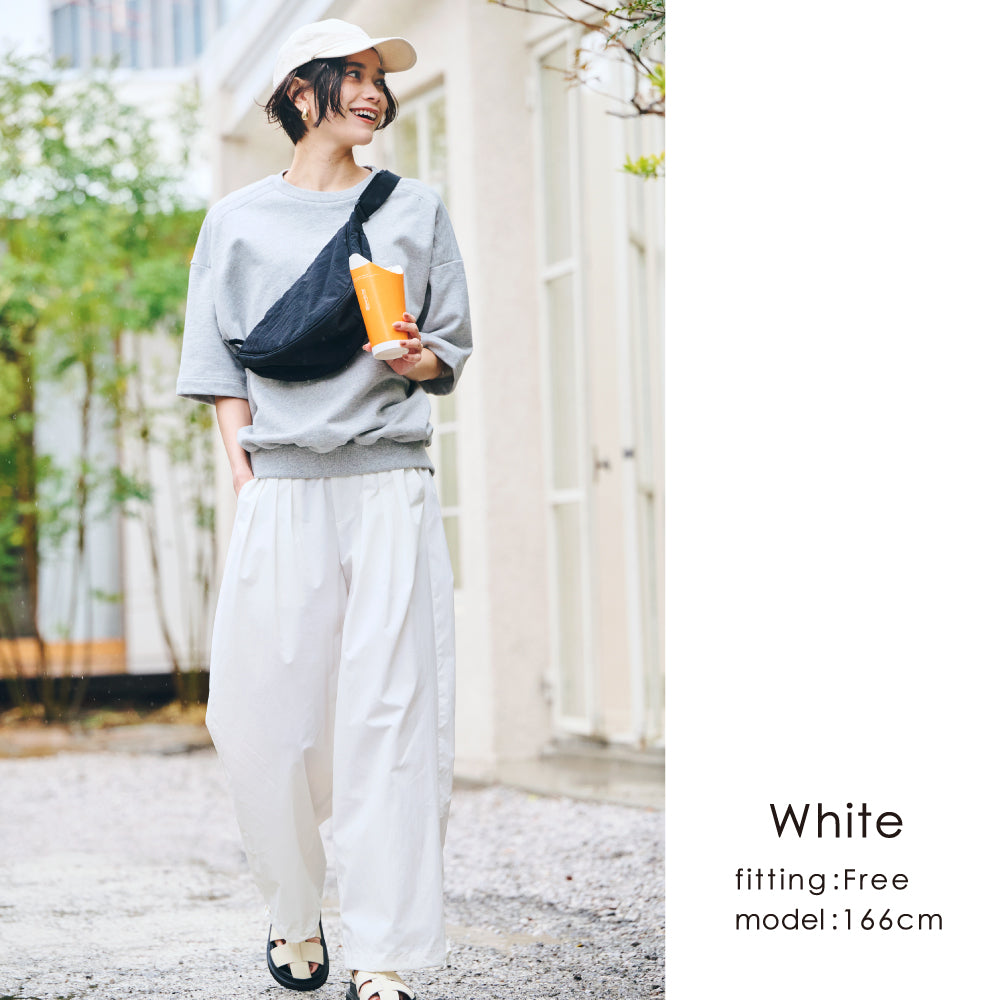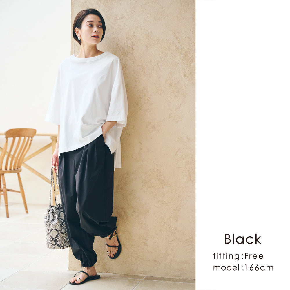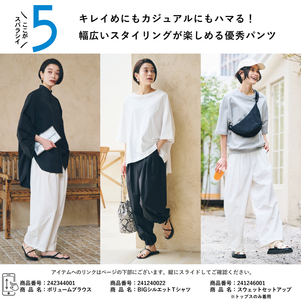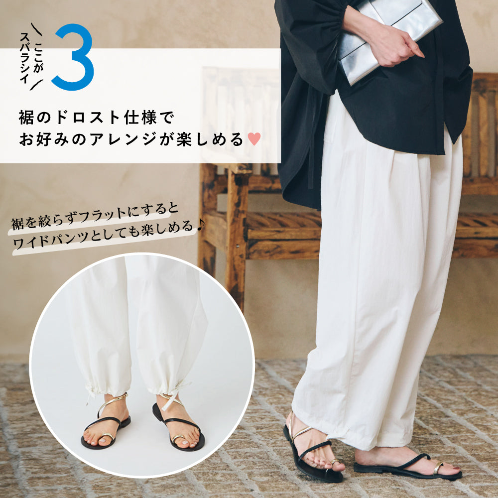 すそをワイドのまま履くか、絞るかで印象がかわるので、1枚で得した気分です!