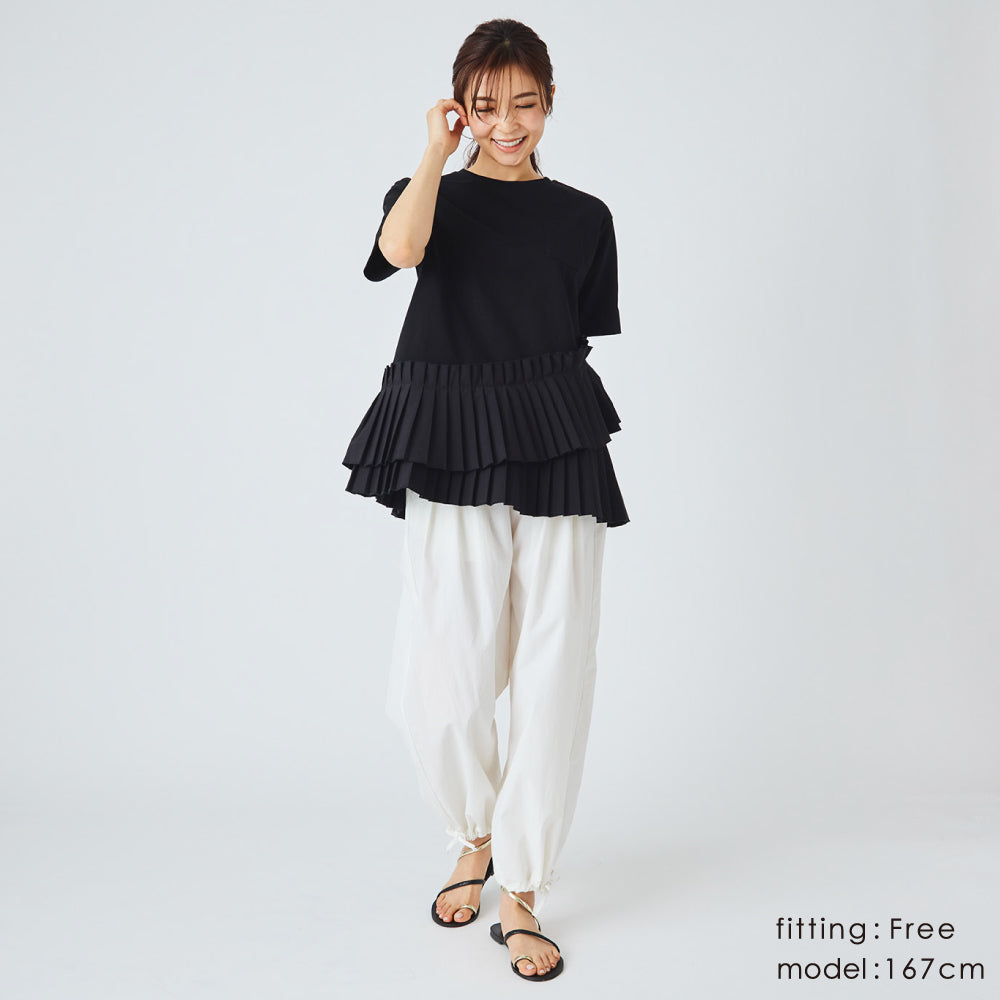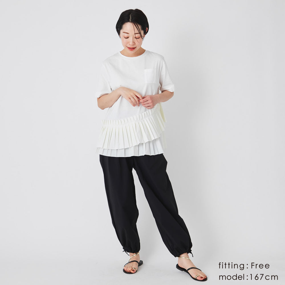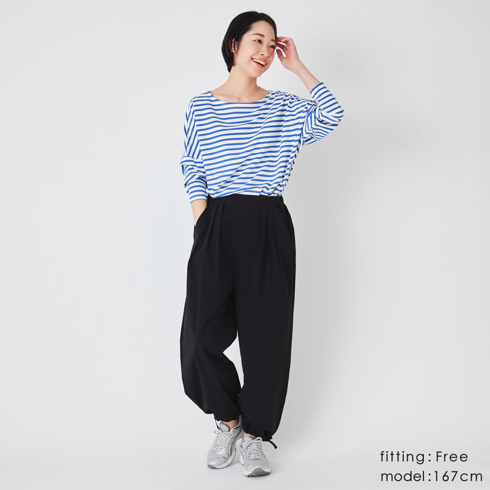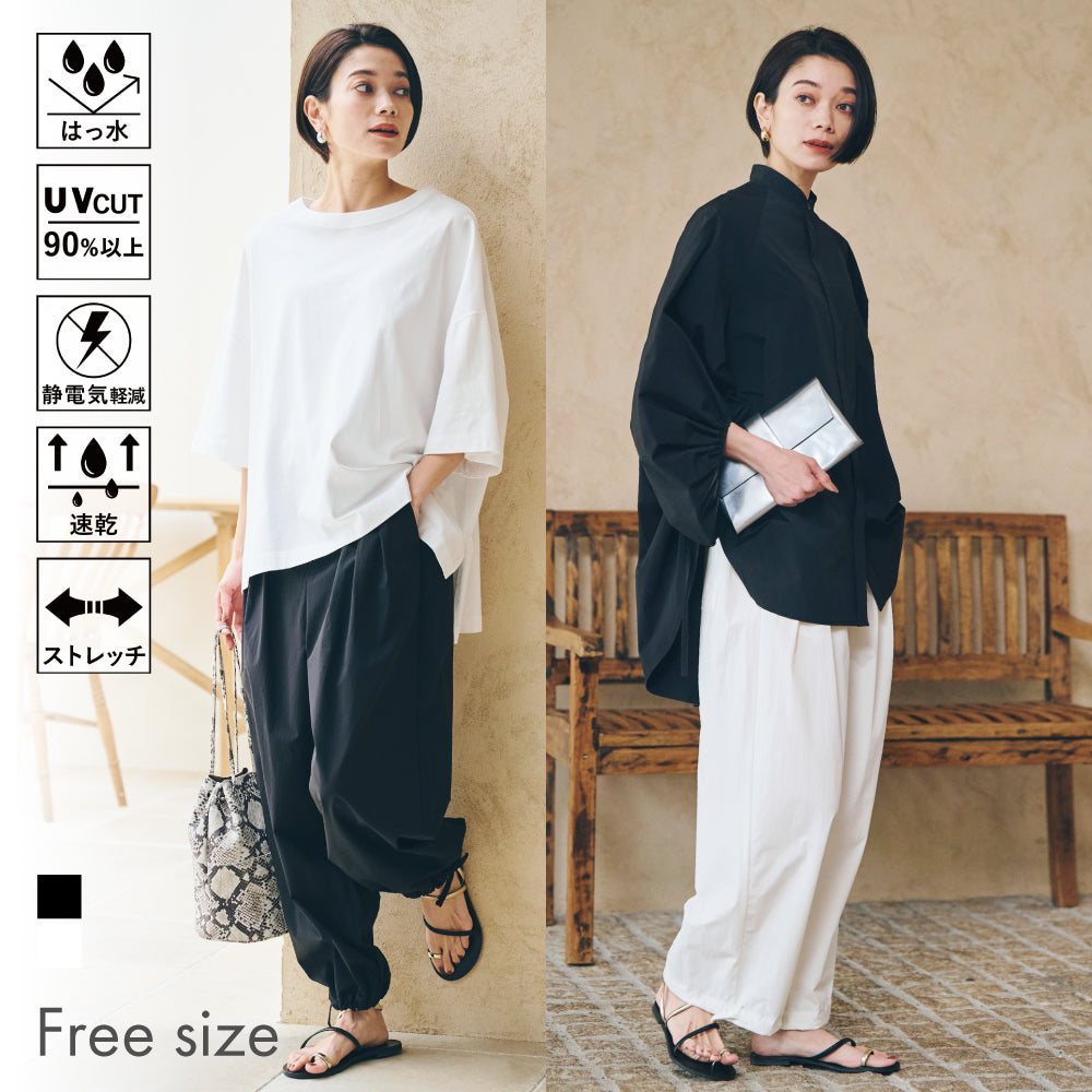すそをワイドのまま履くか、絞るかで印象がかわるので、1枚で得した気分です!