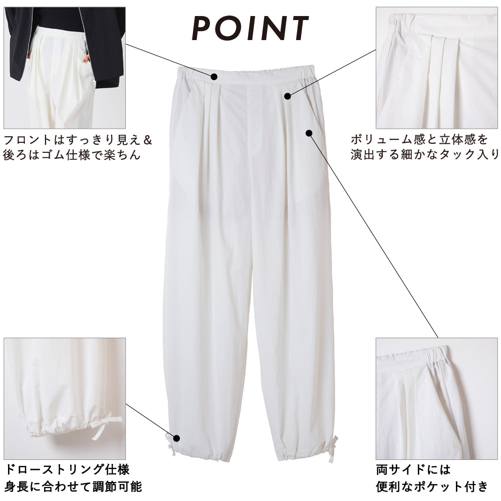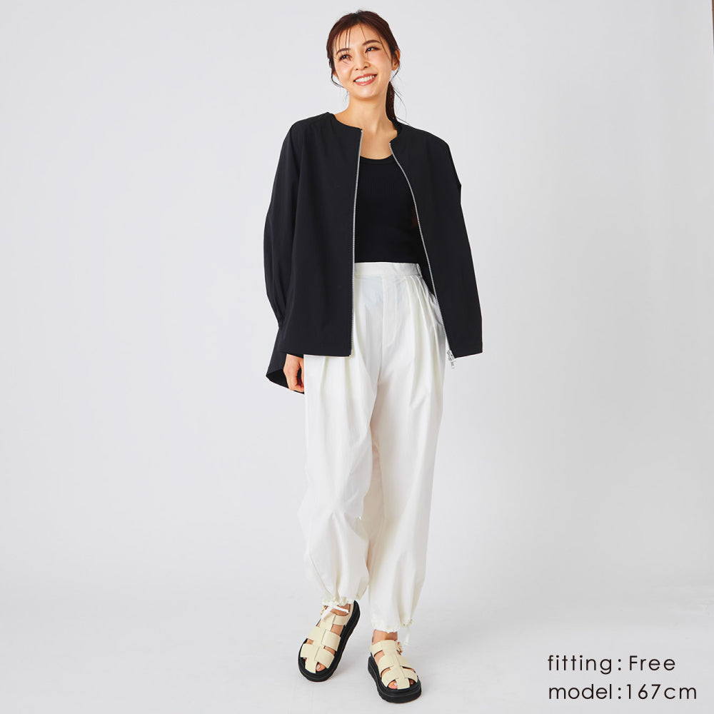 最初はシンプルにワイドの撥水パンツとして履くつもりだったのですが、裾を絞ってはいてみたら丸みを帯びたシルエットがいまっぽく可愛くて、今では絞ったスタイルのほうが好んで履いてます◎
