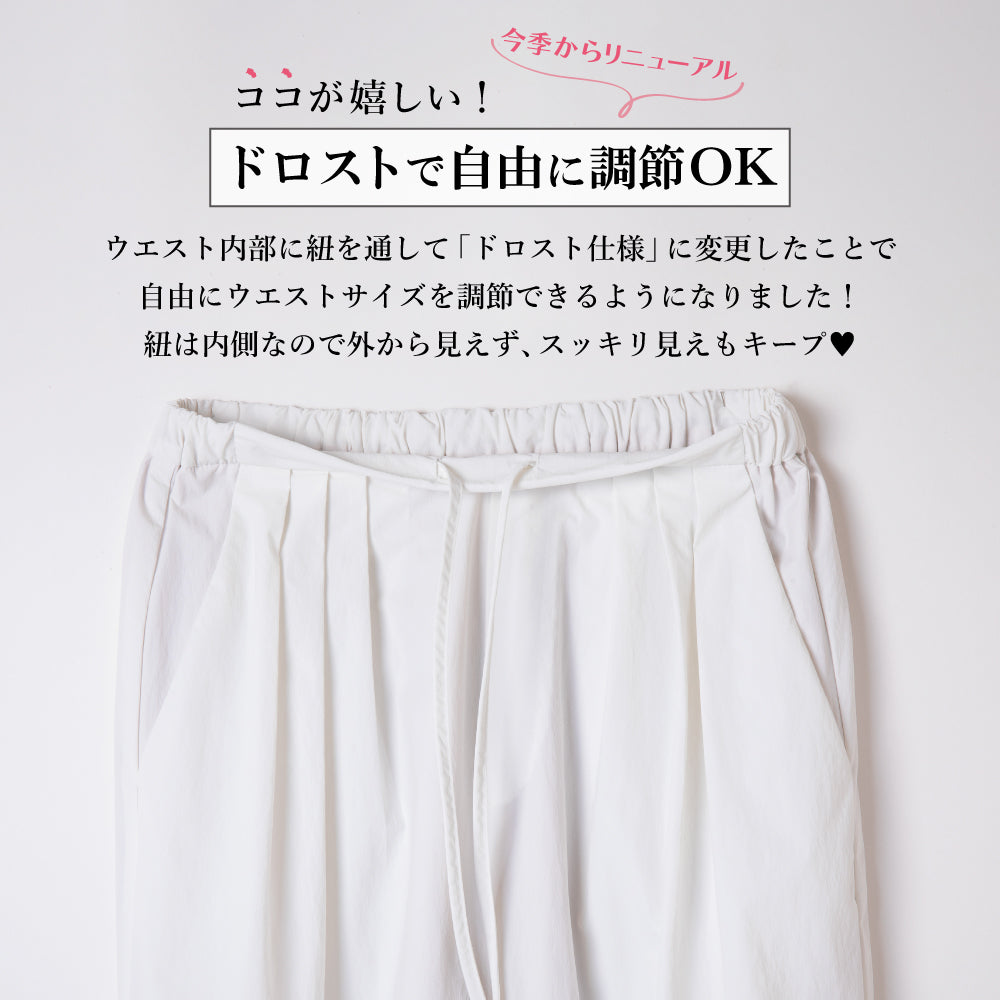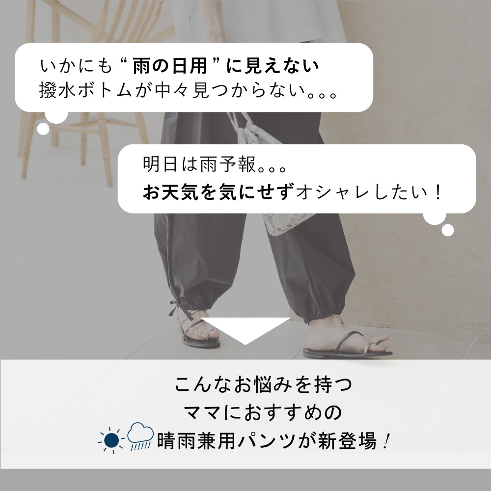 雨の日にいいなあと思って購入しましたが、シルエットもとても綺麗で得した気分になりました。裾を絞るかどうかで印象が変わるのでトップスによって調整してます。 -