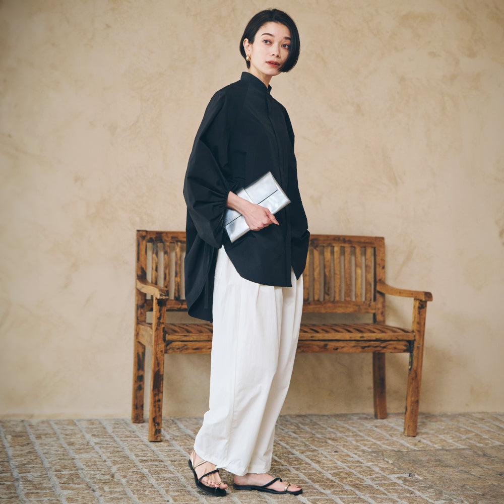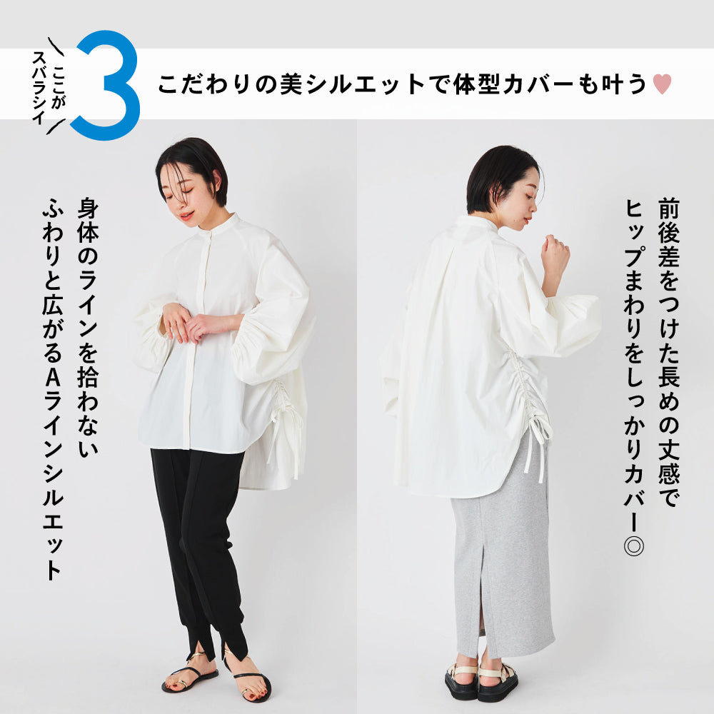 身体のラインを拾わないAラインシルエット。前後差をつけた長めの丈感でヒップまわりをしっかりカバー。