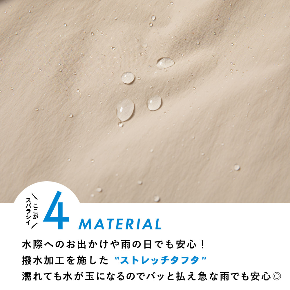 はっ水加工を施した「ストレッチタフタ素材」を使用。濡れても水が玉になるのでパッと払えて急な雨でも安心!