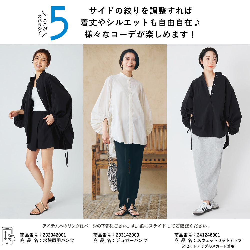 サイドの絞りを調整すれば着丈やシルエットも自由自在♪様々なスタイリングが楽しめます。