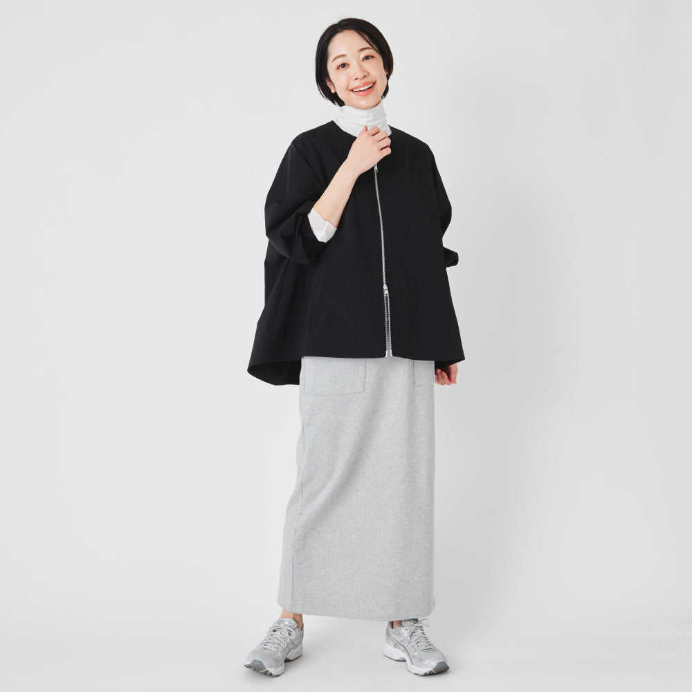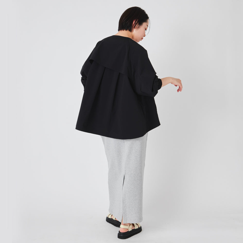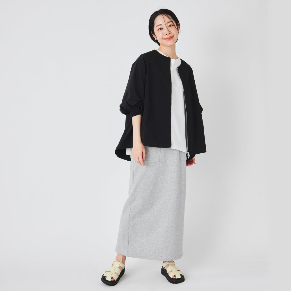 ゆとりを持たせた女性らしいフォルムに七分袖で抜け感をプラス。着丈に前後差をつけることですっきり見えを演出しました。