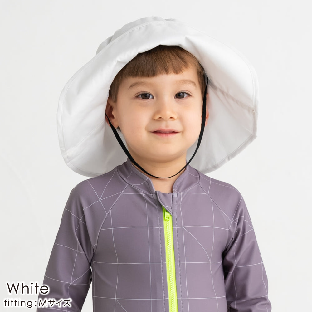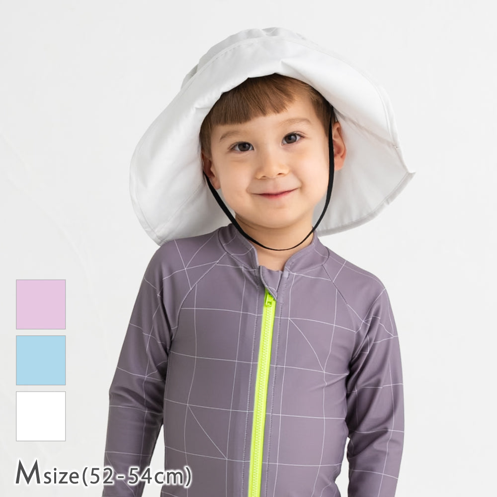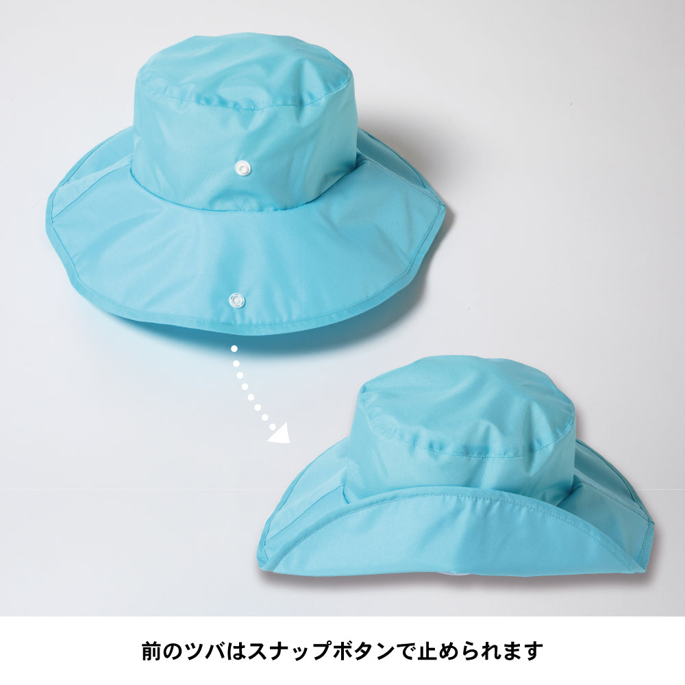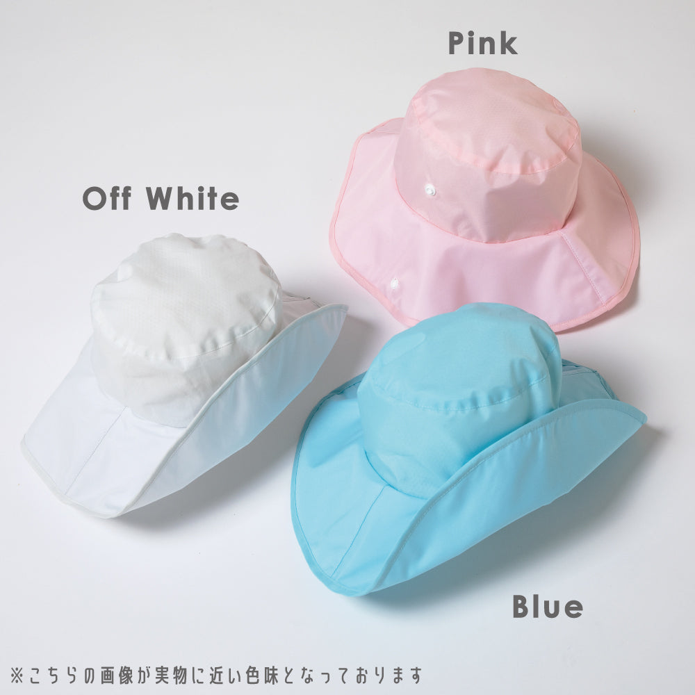 レイン素材のつば広のハットです。雨の日以外にも、浜辺で遊んだり水遊びの時には、頭囲全体につばがあるのでお顔周りを日差しから守り、夏の水辺で大活躍♪