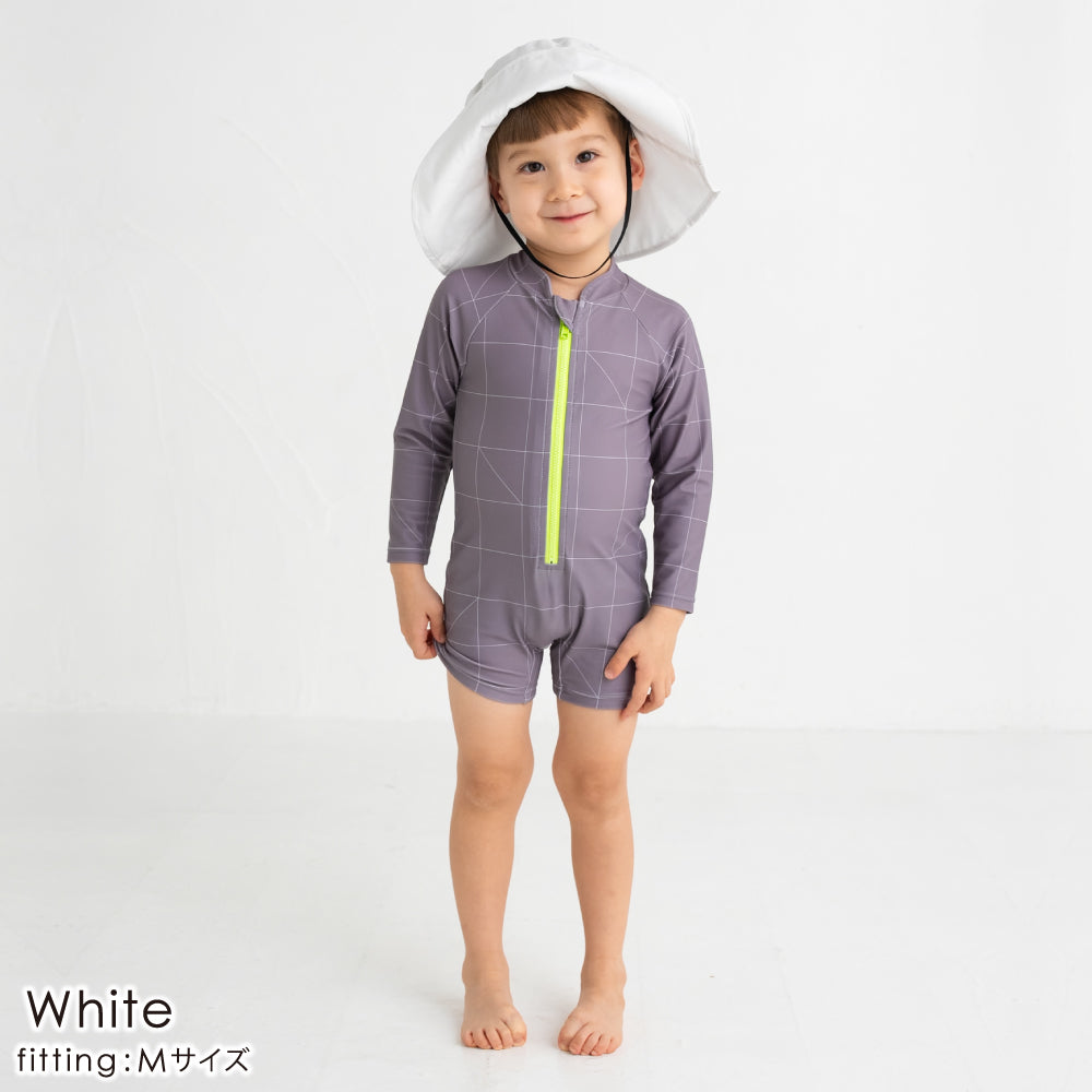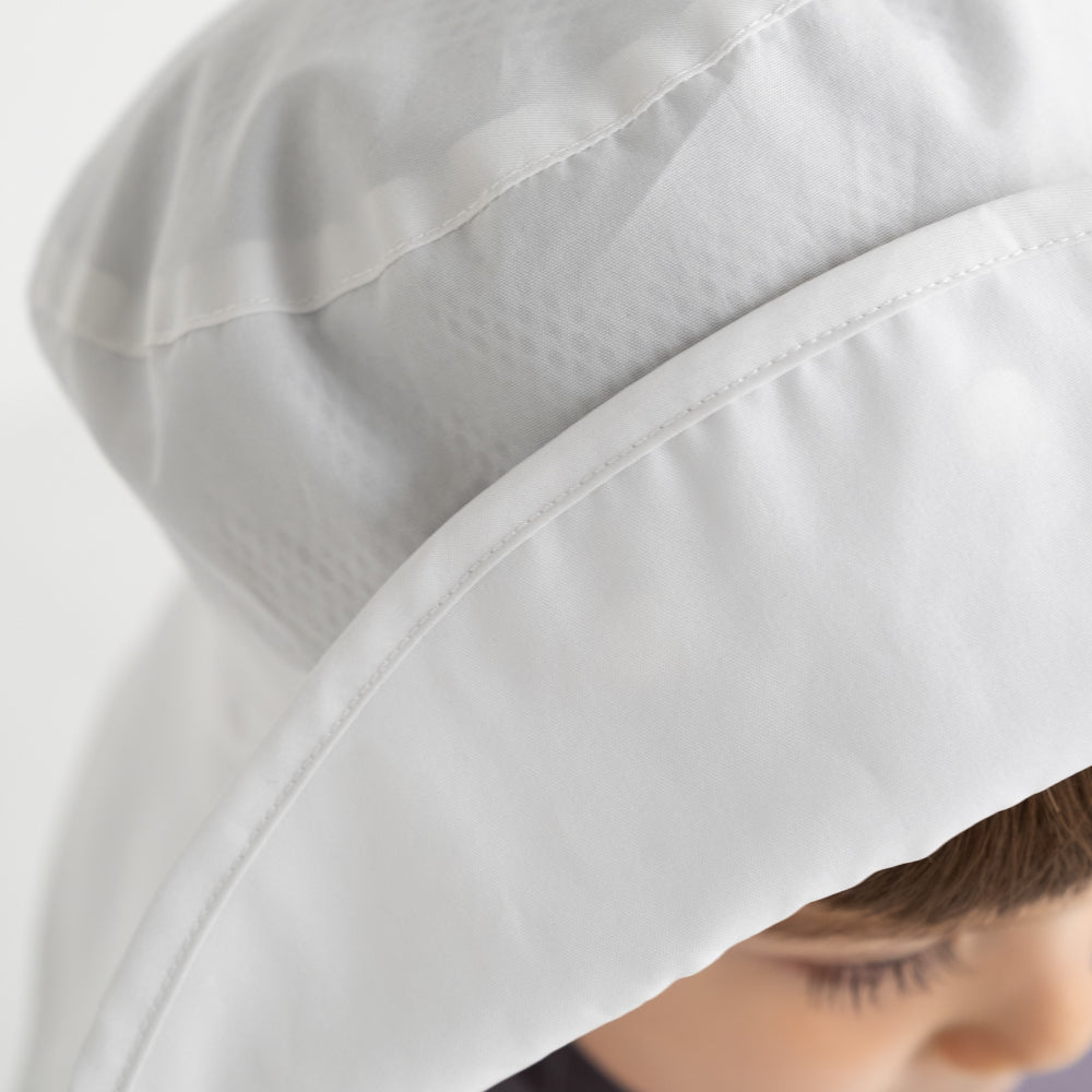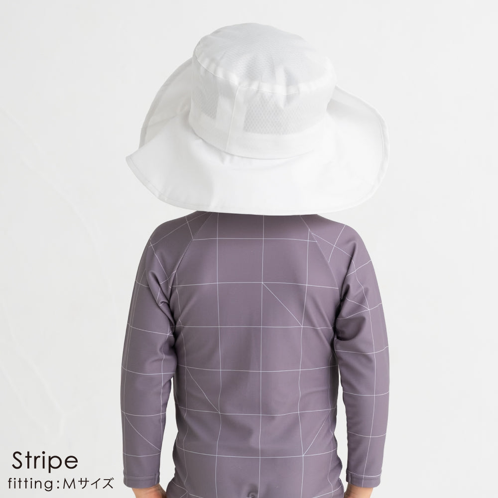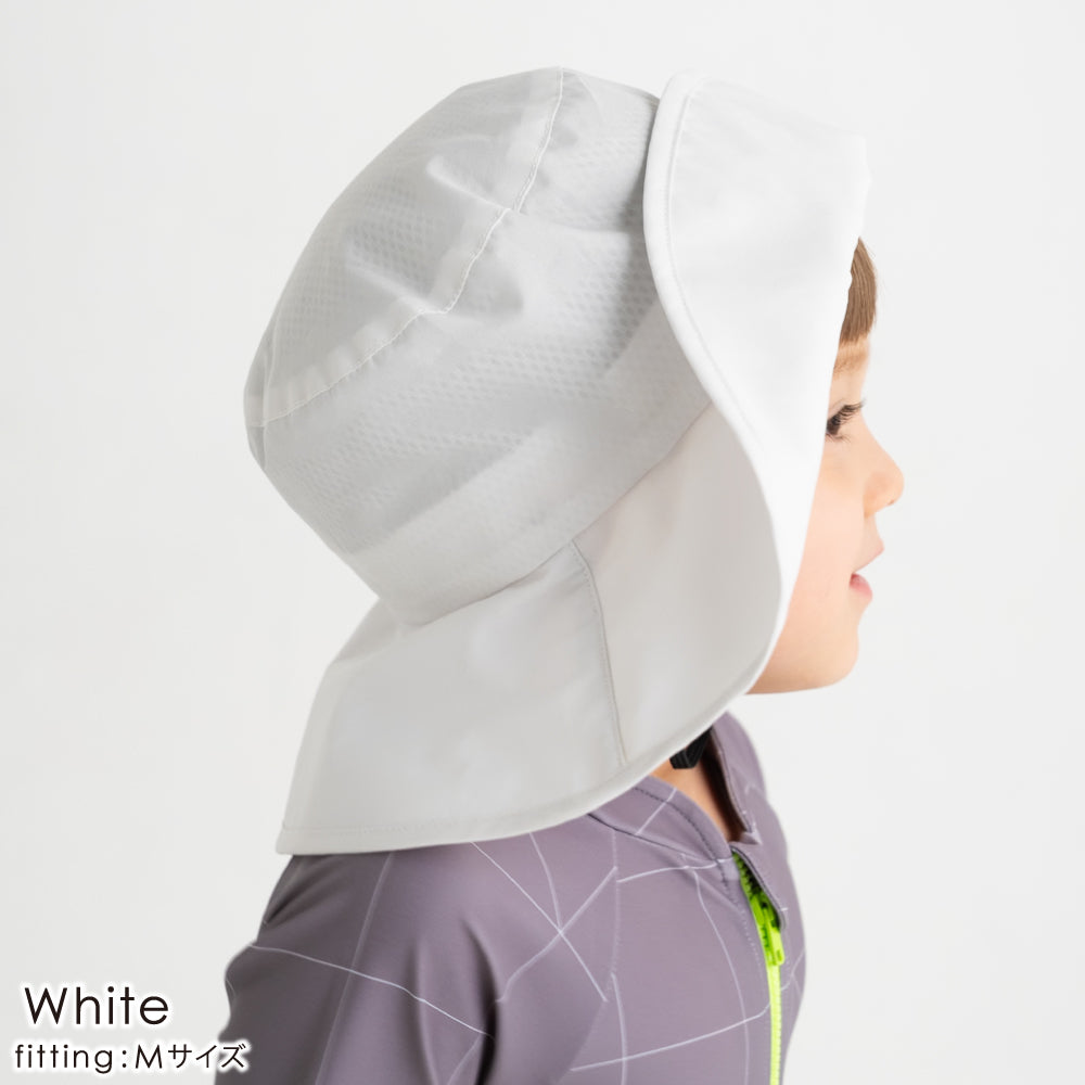 レイン素材のつば広のハットです。雨の日以外にも、浜辺で遊んだり水遊びの時には、頭囲全体につばがあるのでお顔周りを日差しから守り、夏の水辺で大活躍♪