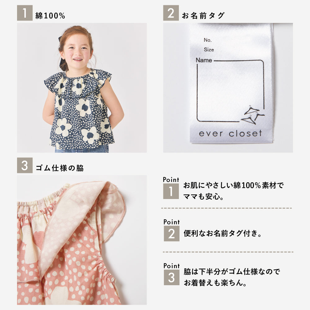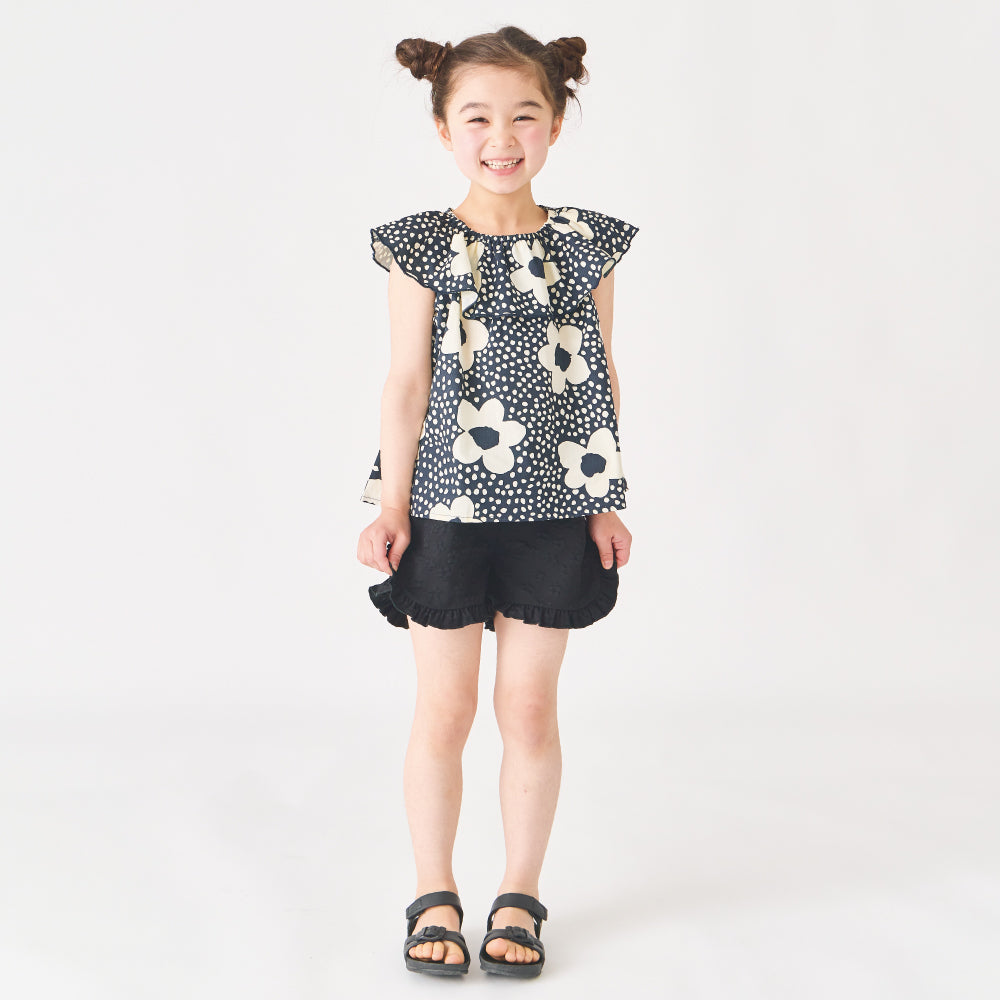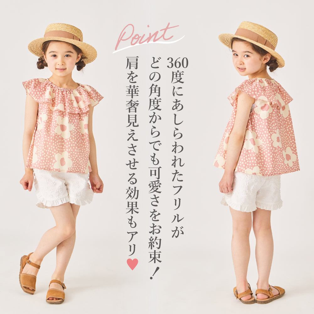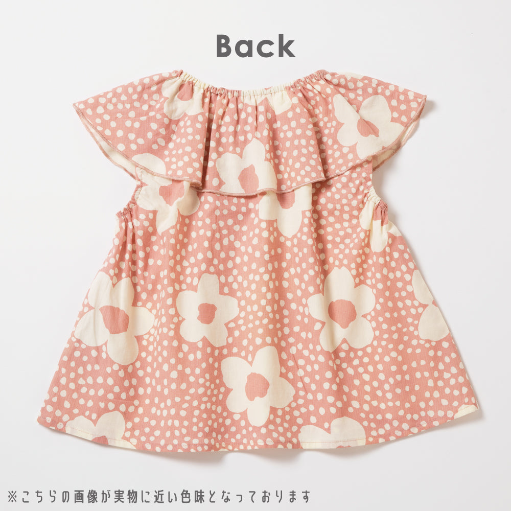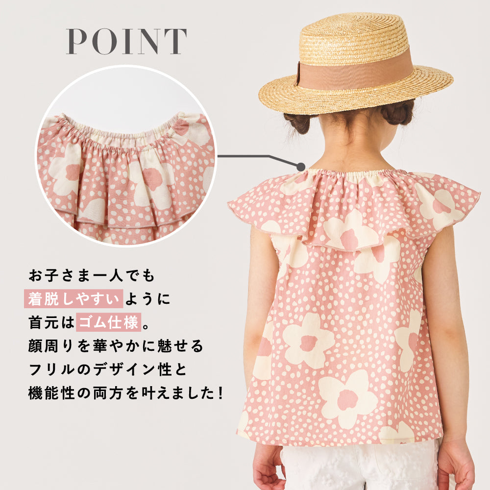 お子さま1人でも着脱しやすいように首元はゴム仕様。顔周りを華やかに魅せるフリルのデザイン性と機能性の両方を叶えました。