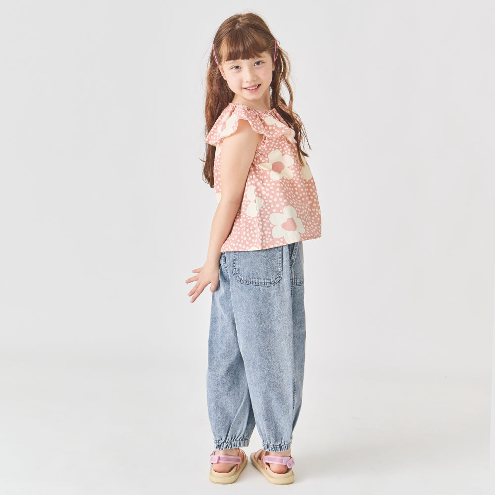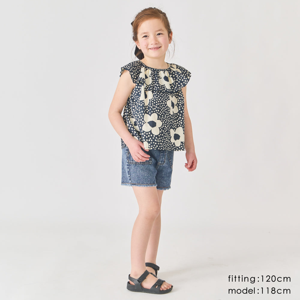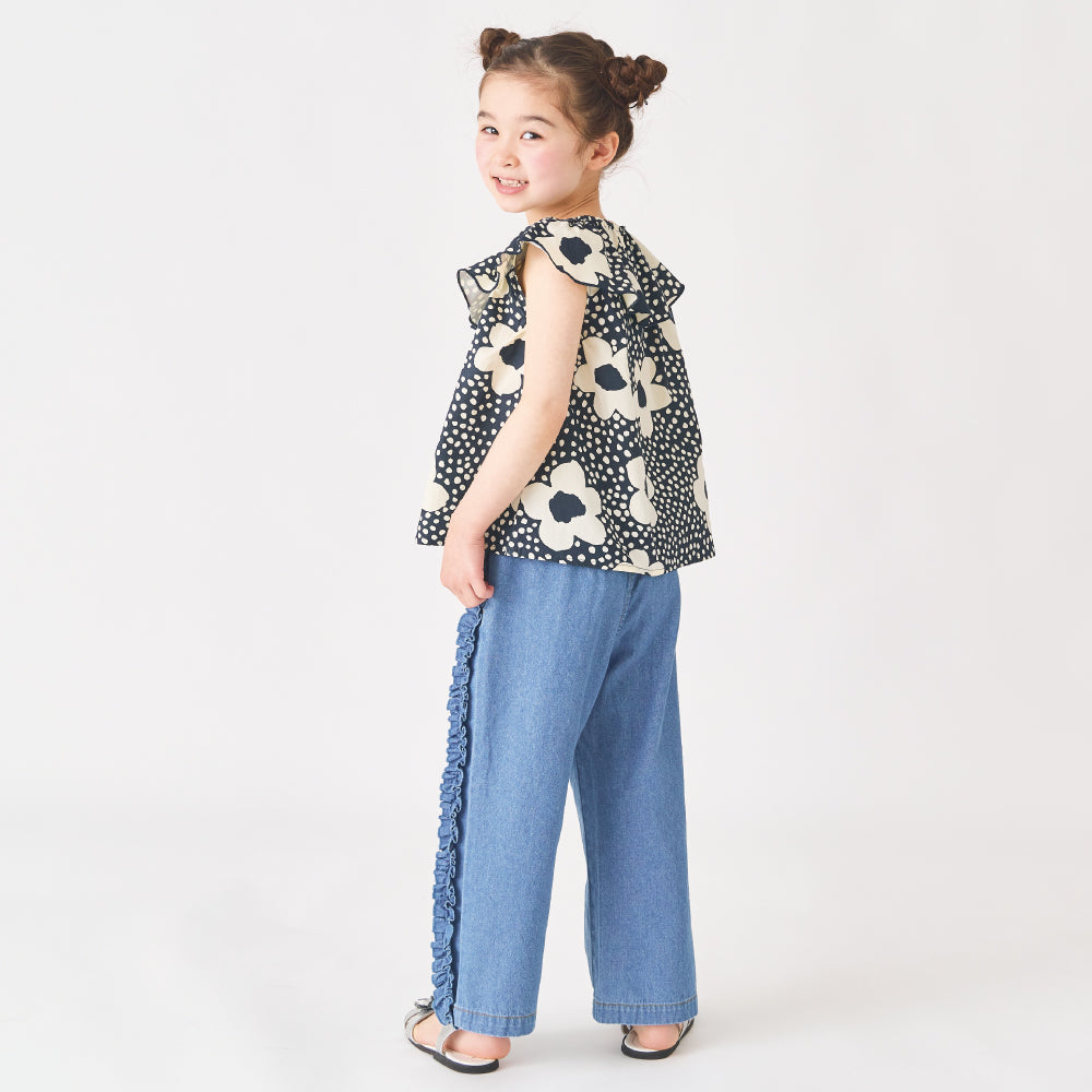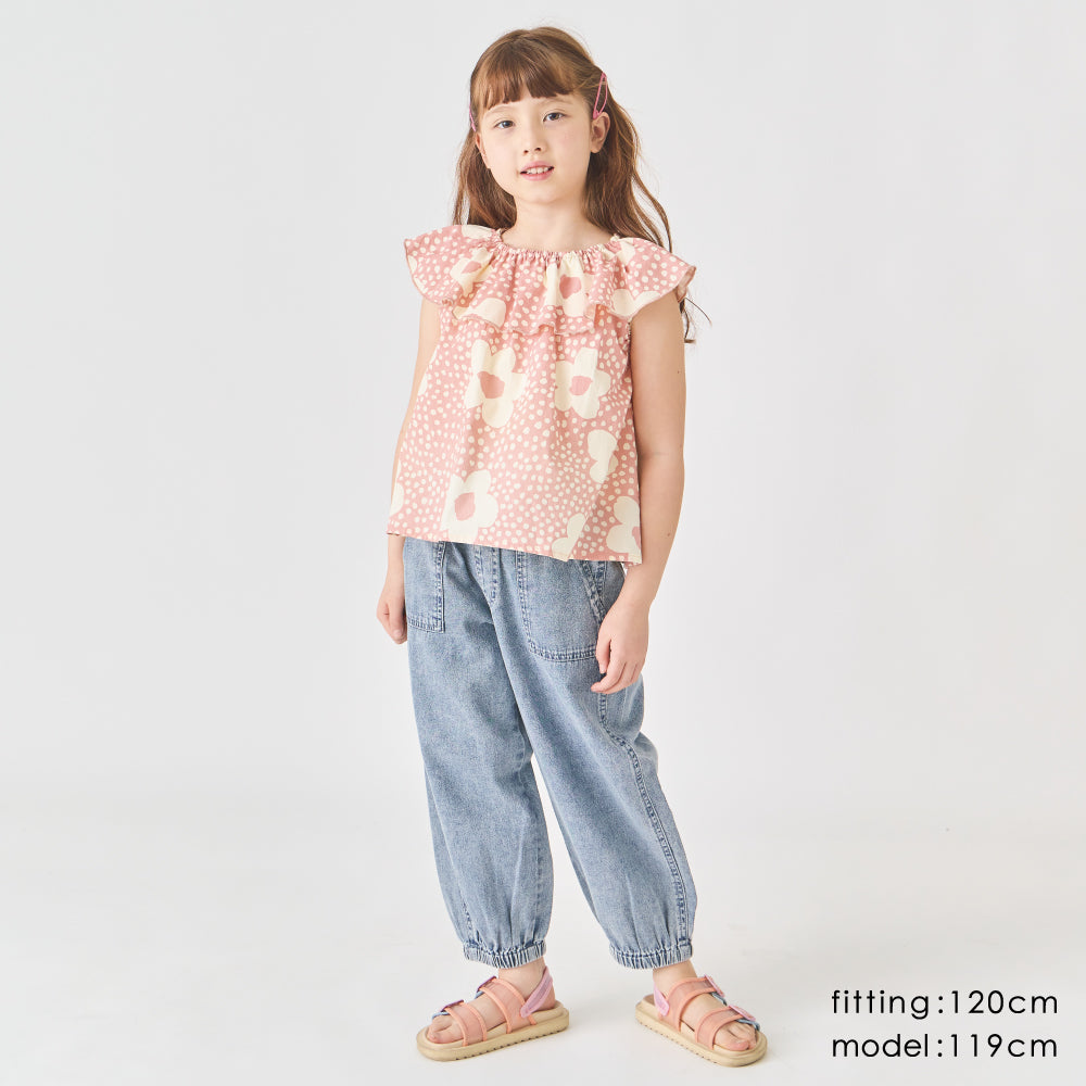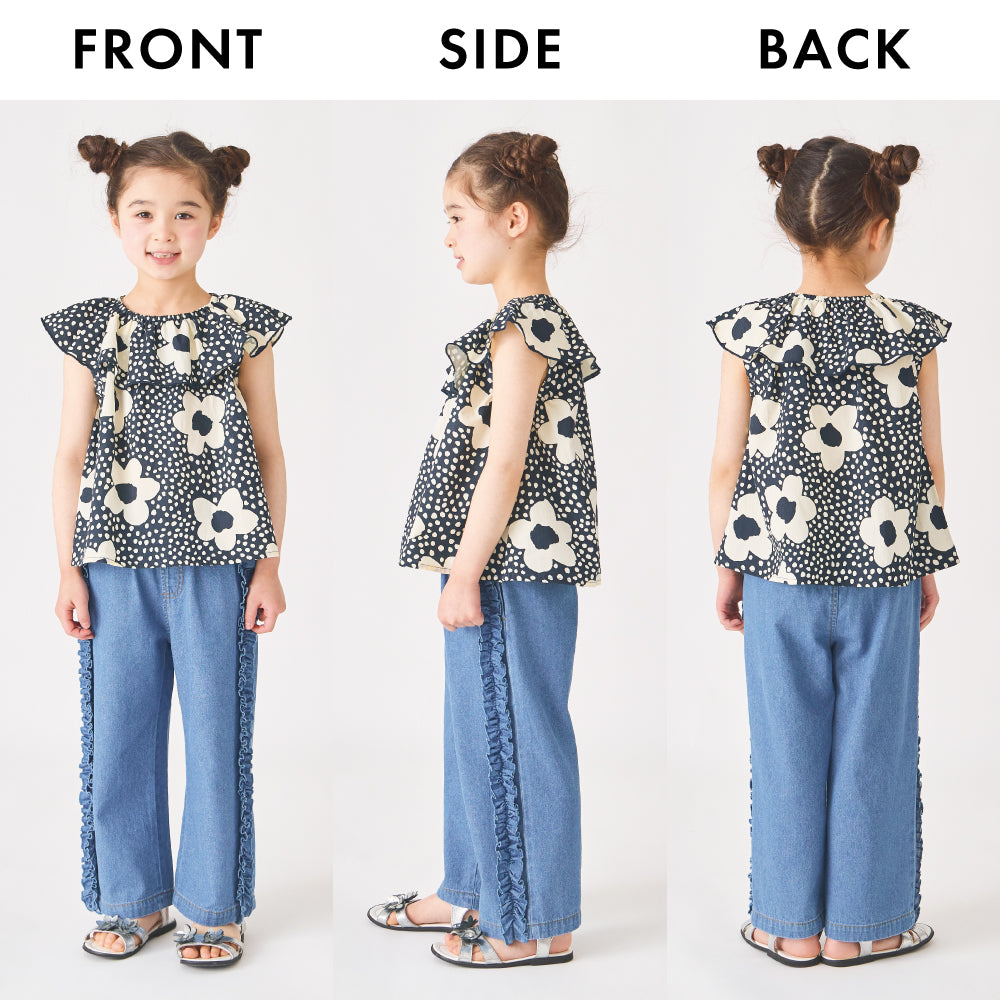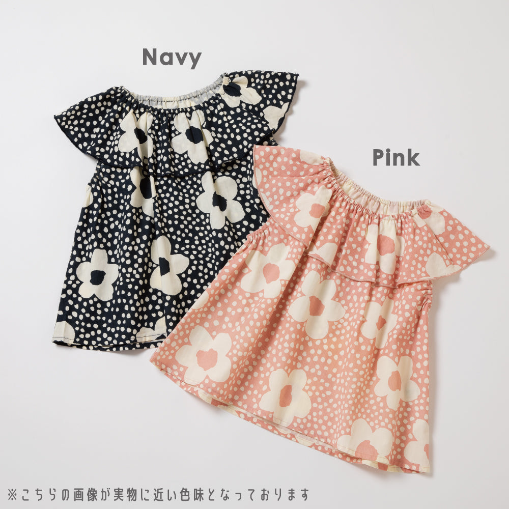 お子さま1人でも着脱しやすいように首元はゴム仕様。顔周りを華やかに魅せるフリルのデザイン性と機能性の両方を叶えました。