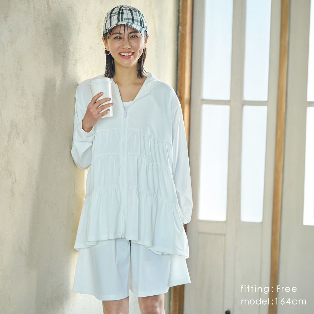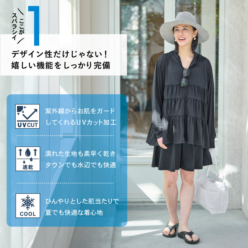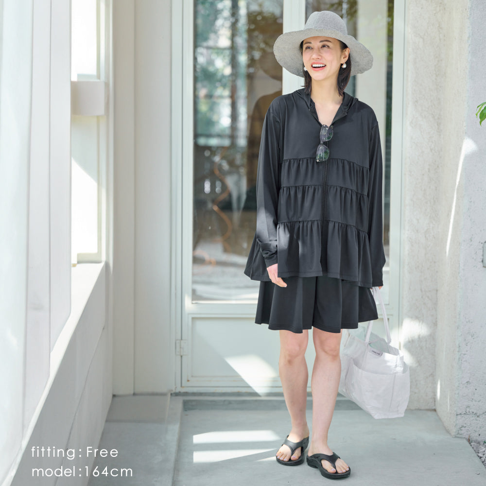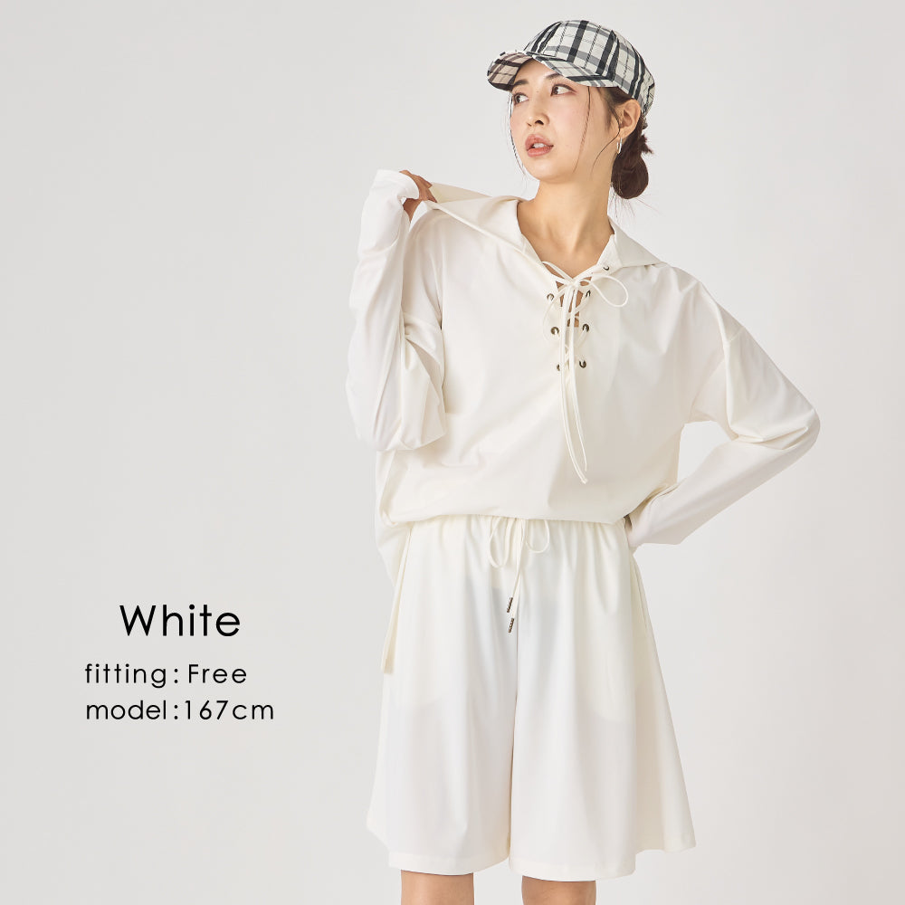 同じ素材の「252143005 ポンチョ型ラッシュガード」や「252145004 ラッシュガード カーディガン」と合わせてセットアップ風の着こなしも◎