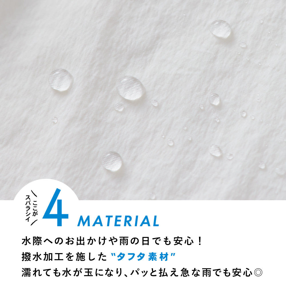 はっ水加工を施した「ストレッチタフタ素材」を使用。