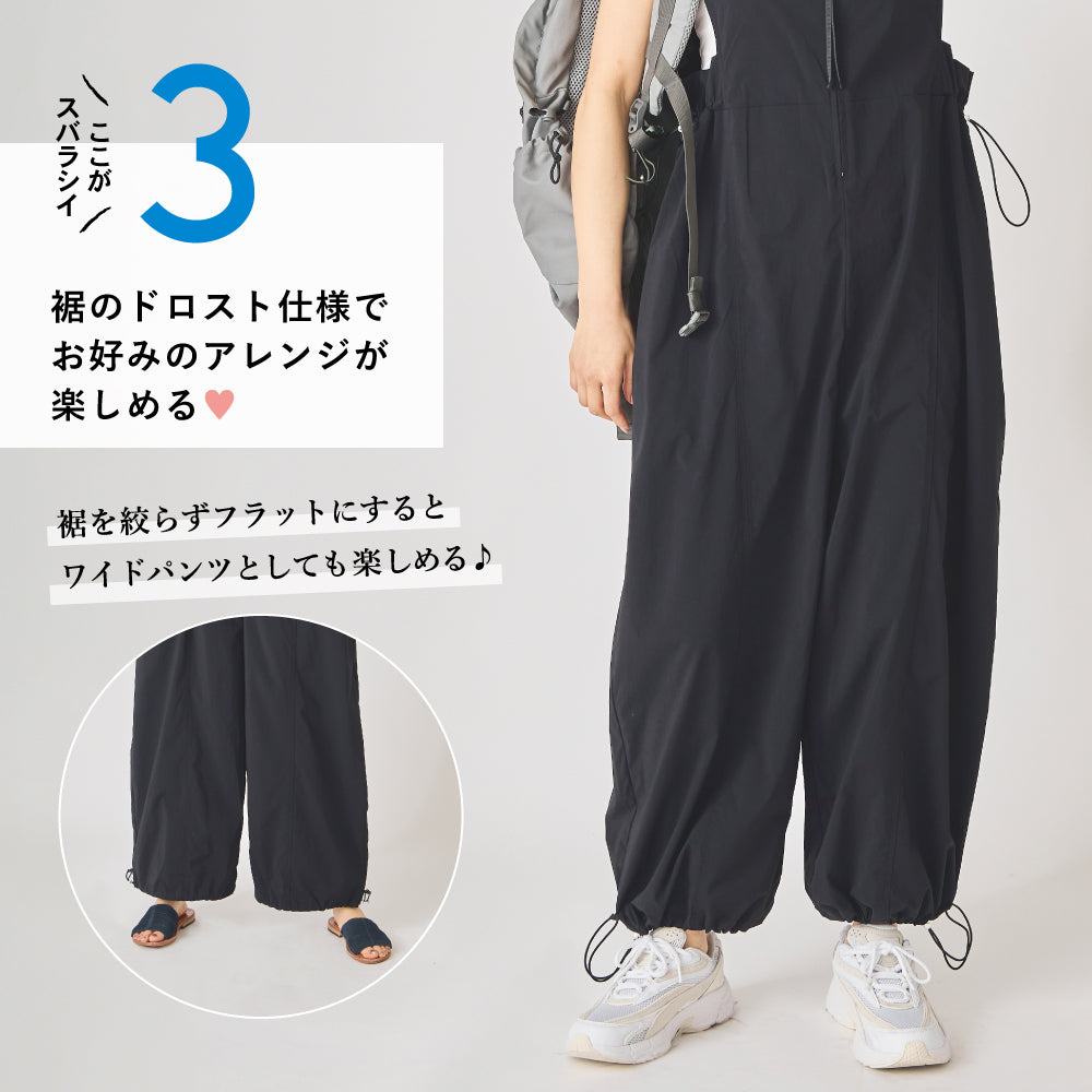 裾のドロスト仕様でお好みのアレンジが楽しめる♪裾を絞らずフラットにするとワイドパンツとしても楽しめます。